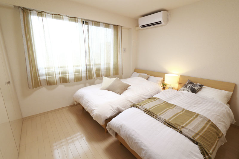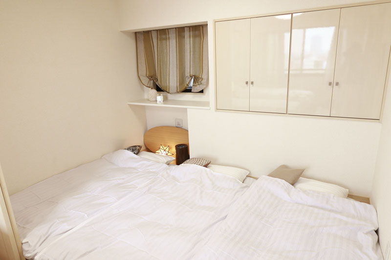 ヘッドサイドのライトやブランケットで温かみを添え、ホテルライクでありながらも家庭的な柔らかさを感じる雰囲気に。