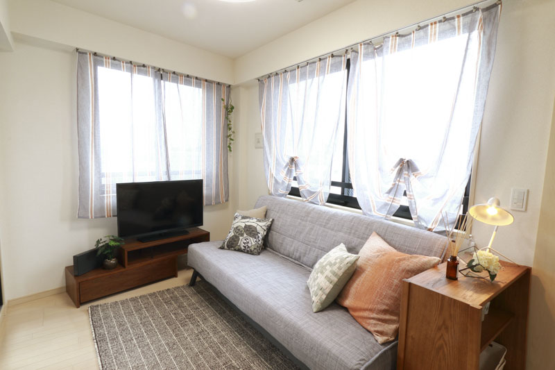 木の質感を活かした家具とグレーのソファで落ち着きを出し、淡いブルーのカーテンやクッションで軽やかさを演出。