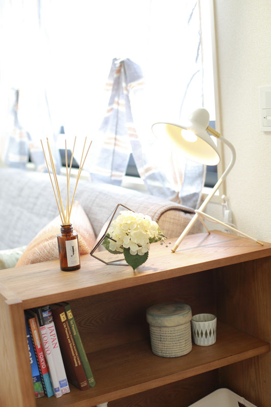 小物には陶器やガラスを使い、やわらかい光が差し込む心地よいリビングシーンを作りました。