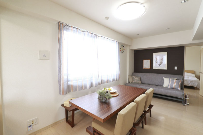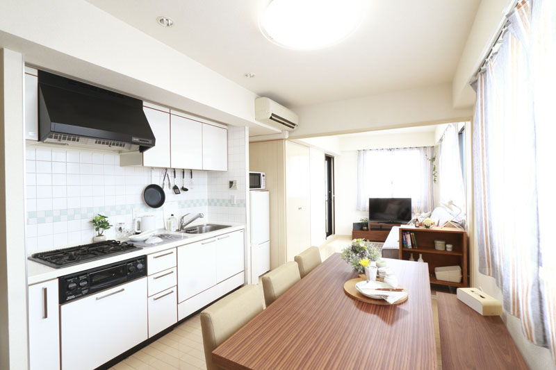 リビング・ダイニング・キッチンがひと続きになる空間構成を活かし、視線の抜けを意識した配置で開放感を持たせています。