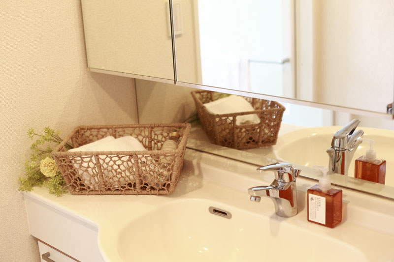 洗面・トイレはホワイトを基調に、ナチュラル素材のバスケットやグリーンを添えて清潔感を演出。