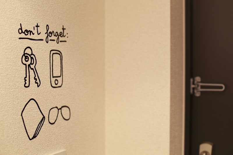 玄関のウォールステッカーは「忘れ物防止」をユーモラスにデザインし、実用性と遊び心を兼ね備えたアクセントにしています。
