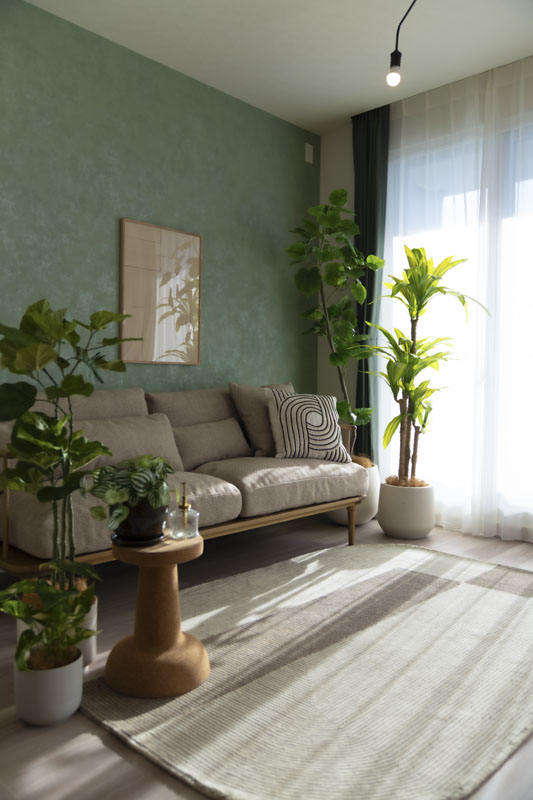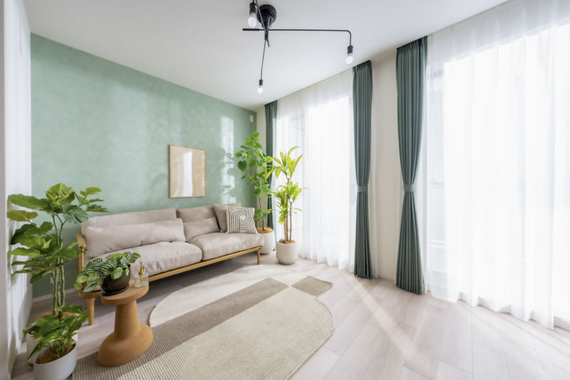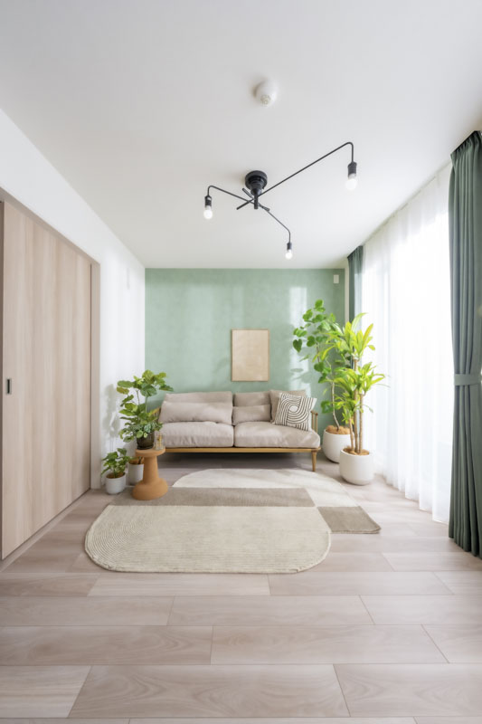 壁紙とカーテンのつながりを意識し、グリーンを締め色として効かせることで、空間に奥行きと統一感を持たせました。