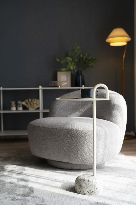 静かな表情のアートや木の風合いが引き立つソファ、コルクのサイドテーブル、麻のような質感のラグなど、素材感を大切にセレクト。