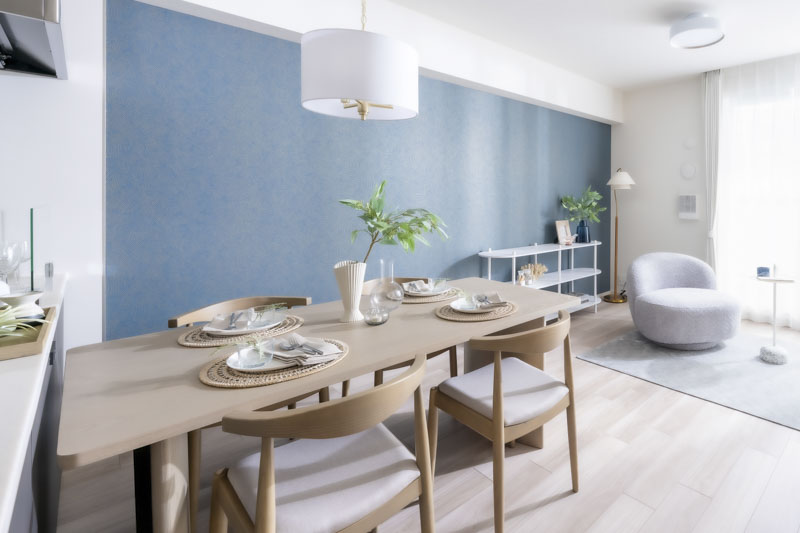 揺らぎを感じる壁紙に忍ばせた金のニュアンスは、照明と響き合い、昼は自然光でやわらかく、夜は灯りの中で上品に浮かび上がります。