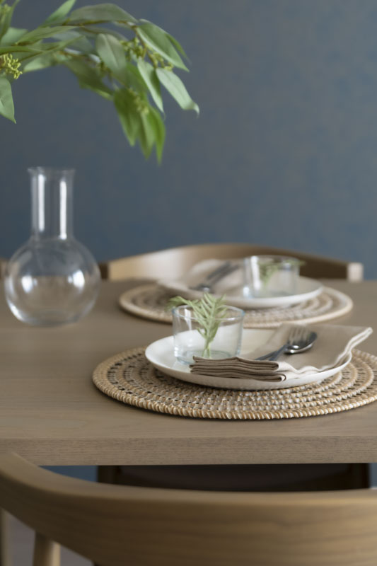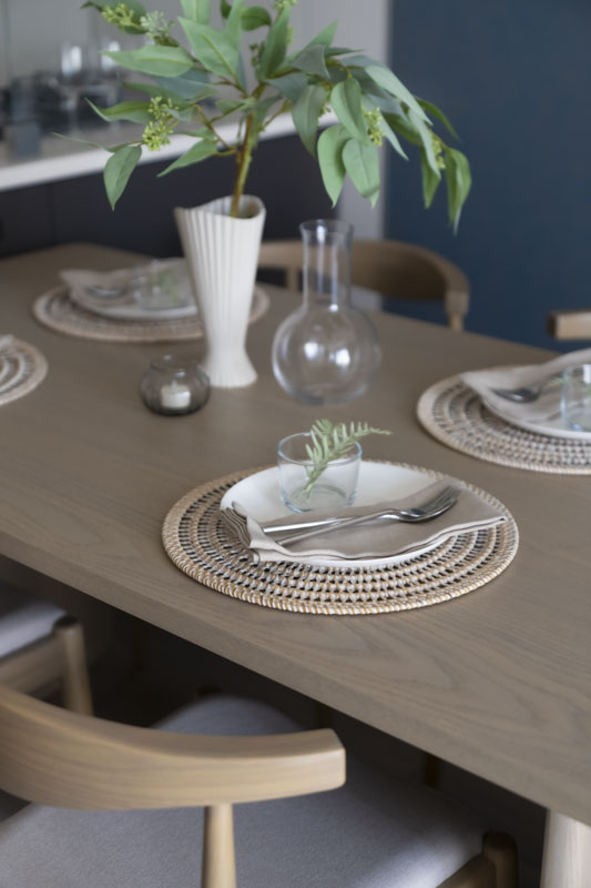 幹のある木のテーブルに、白い器や貝殻のモチーフ、タモ網のようなマットを添えて、さりげなく海を感じるしつらえに。