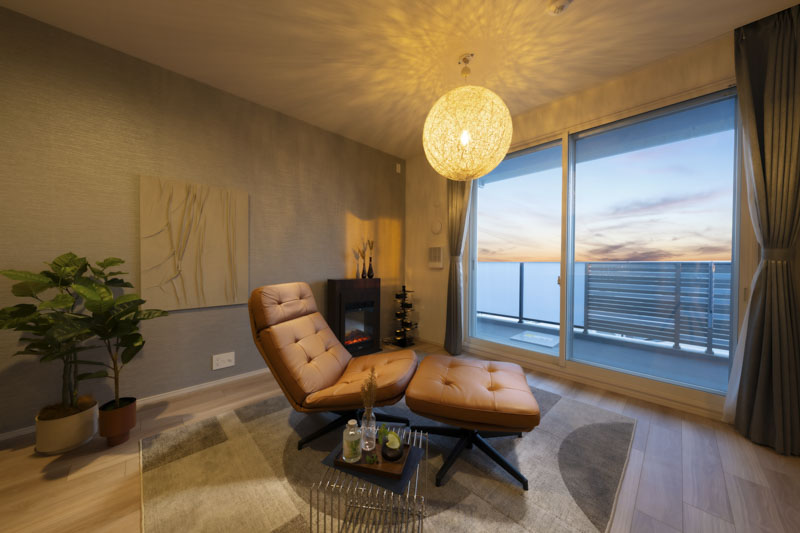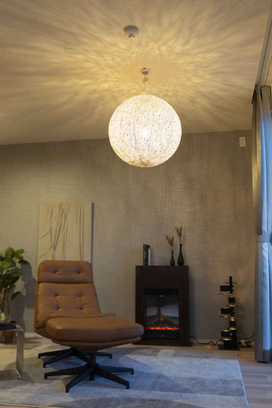 丸い灯りや質感のある壁のアート、揺らぎを楽しむインテリア暖炉が、夜のリビングをやさしく包み込み、良質な眠りへと導きます。