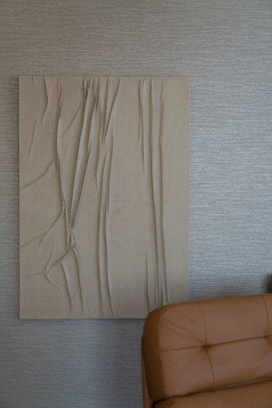 凹凸のあるアートや壁面は、光の当たり方で陰影が変わり、空間に奥行きを生み出します。